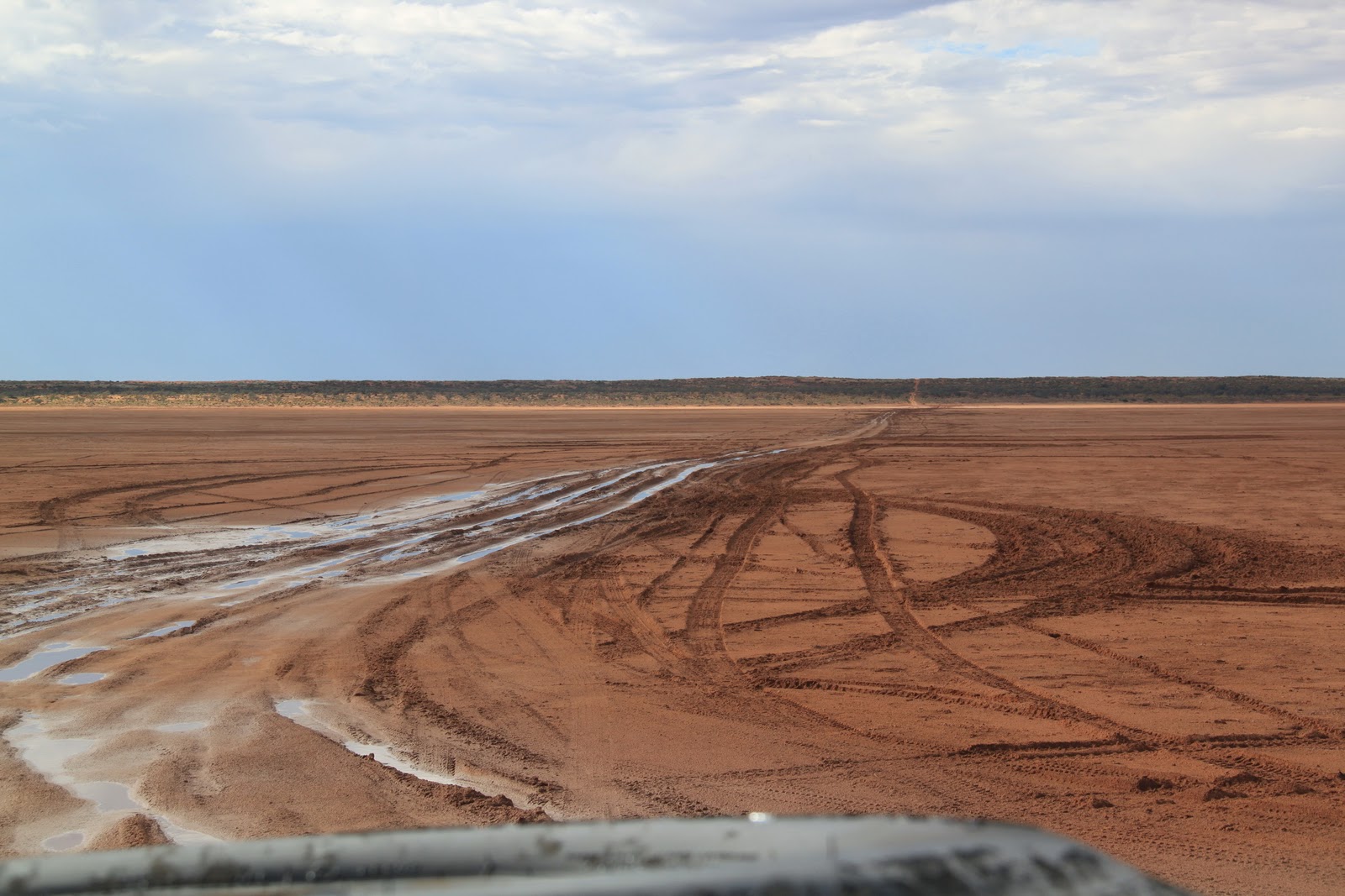 We then had to turn east, straight across the centre of the north half of the lake on the QAA Line to Birdsville. It was such a long crossing. Deep ruts, water and mud. After our previous experience we were pretty worried about getting bogged half way across. Staying in the ruts, we kept our speed up and went flying across with mud and water spraying everywhere. The longest claypan crossing we've done, and the recent downpour made it scary but fun with it getting deeper on the eastern side. I think it was getting close to needing to divert north around the top half. Brian contacted us to check if we'd made it across so he knew whether or not to try.